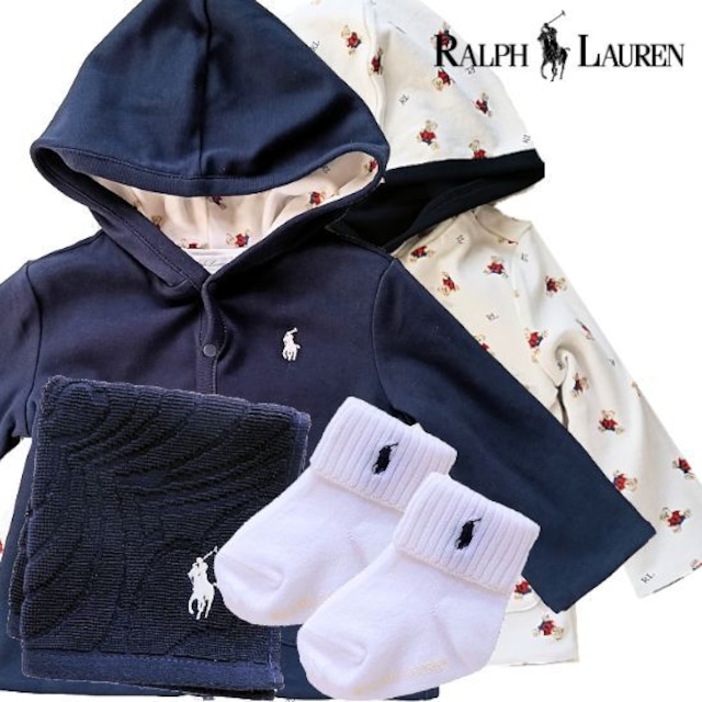 ラルフローレン男の子出産祝い 定番ネイビーパーカー祝福セット ラルフローレンの定番ネイビーパーカーと靴下、タオルハンカチがセットになった男の子出産祝いです。生後9ヶ月くらいから着せることができます。 シンプルでジッパータイプですので初めての育児ママやパパにも着せやすいパーカーです。 おしゃれでありながら機能性も備えたアイテムが揃っていますので、大切な方への贈り物にぴったりです! お祝いセット内容 1.ラルフローレン ネイビーパーカー 2.ラルフローレン 赤ちゃん靴下 3.ラルフローレン タオルハンカチ ★ラルフローレン ネイビーパーカー このパーカーは、シンプルでありながら上品なデザインが特長です。 生後9ヶ月からご着用いただけ、フォーマルなシーンでもカジュアルなシーンでも大活躍します。体温調整もできるので季節を問わずご利用いただけます! 内側の素材が裏起毛のように暖かですので夏以外に着用がおすすめです。 ★ラルフローレン 赤ちゃん靴下 可愛いデザインの靴下は、赤ちゃんの小さな足を優しく包みます。1歳頃にご利用可能で、お出かけには欠かせないアイテムです。お洒落に敏感なパパママにも好評のデザインです。 ★ラルフローレン タオルハンカチ 柔らかな素材で作られたタオルハンカチはサイズ25×25cmで、赤ちゃんのお肌にも優しく、様々なシーンで重宝します。お出かけ時やお食事の際に大活躍します! (無料) ラッピングは2種類からお選びいただけます。また、赤ちゃんの名前シールをギフトボックスにお付けいただくサービスもございます。 (有料) (1)メッセージカード 100円 (2)手さげ袋 100円 (3)熨斗(のし) 100円 熨斗(のし)、メッセージカード、手さげ袋など、詳細は三角矢印マークを押すと追加購入が可能です。 ご不明な点はメールにてお気軽にお問い合わせください。営業時間外でもできるだけ早くお返事いたします。
