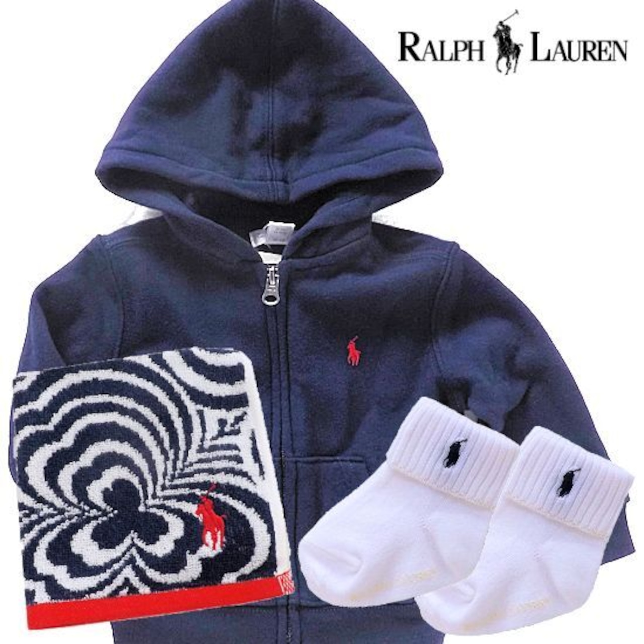 ラルフローレンの定番ネイビーパーカーと靴下、タオルハンカチがセットになった男の子出産祝いです。生後9ヶ月くらいから着せることができます。