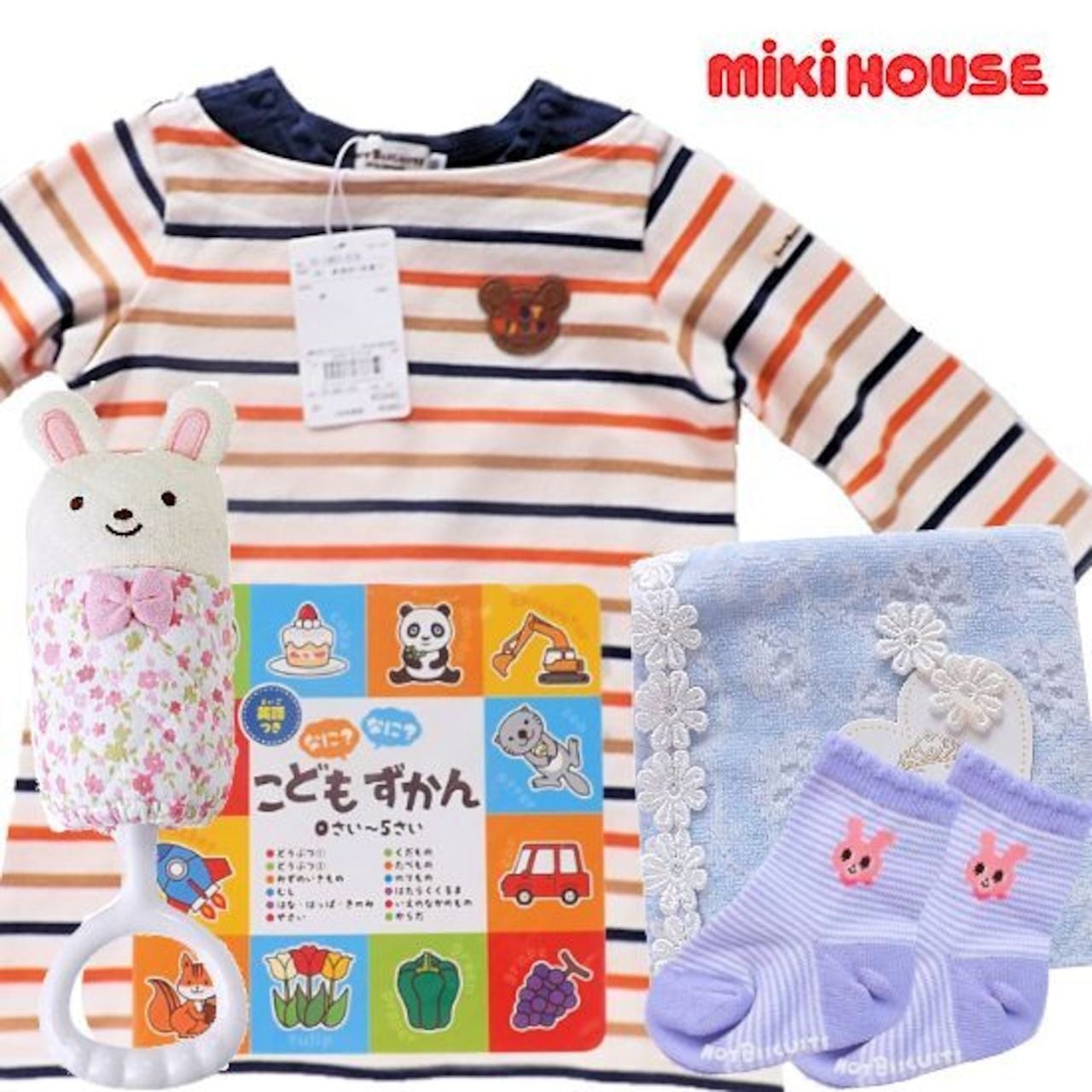 価格 11,000円(税込) こちらの女の子出産祝いは、ミキハウスのベビー服、ピアノ遊びが楽しめるおんがくえほん、靴下、ミキハウスのUVスキンケアの5点が入っています。